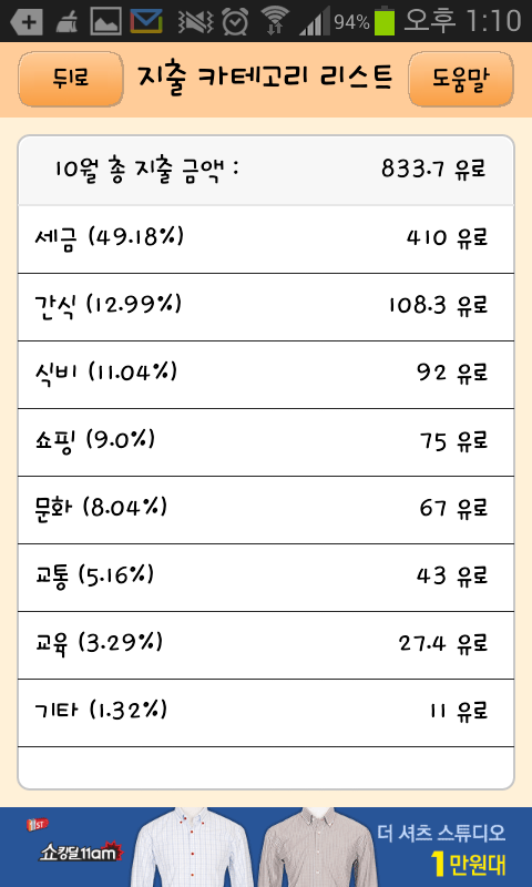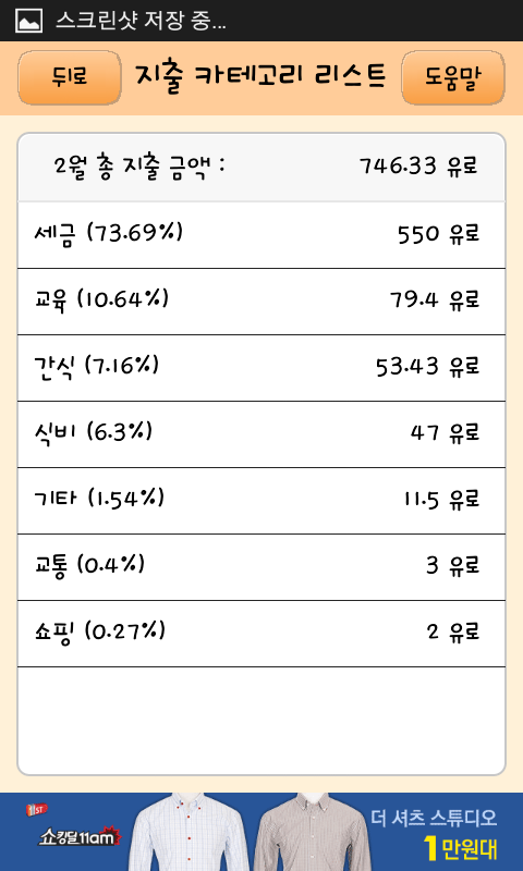 저는 지금까지는 장학금을 받고 있고 유학비로는 저렇게 제채비 위주로 들어왔지요. 왠만하면 생활비를 아끼려고 노력했던 것 같습니다. 1유로가 한화로 1400원정도 인데 1500원으로 잡고 소비했습니다. 장을 볼때 (여기는 할인이 수시로 있습니다) 이왕이면 세일. 조금 더 걸어서 싼것 있으면 싼 마트를 가고 유학 마치고 짐정리하려고 내놓은 한국유학생 분들로부터 중고품 사는식이였습니다.